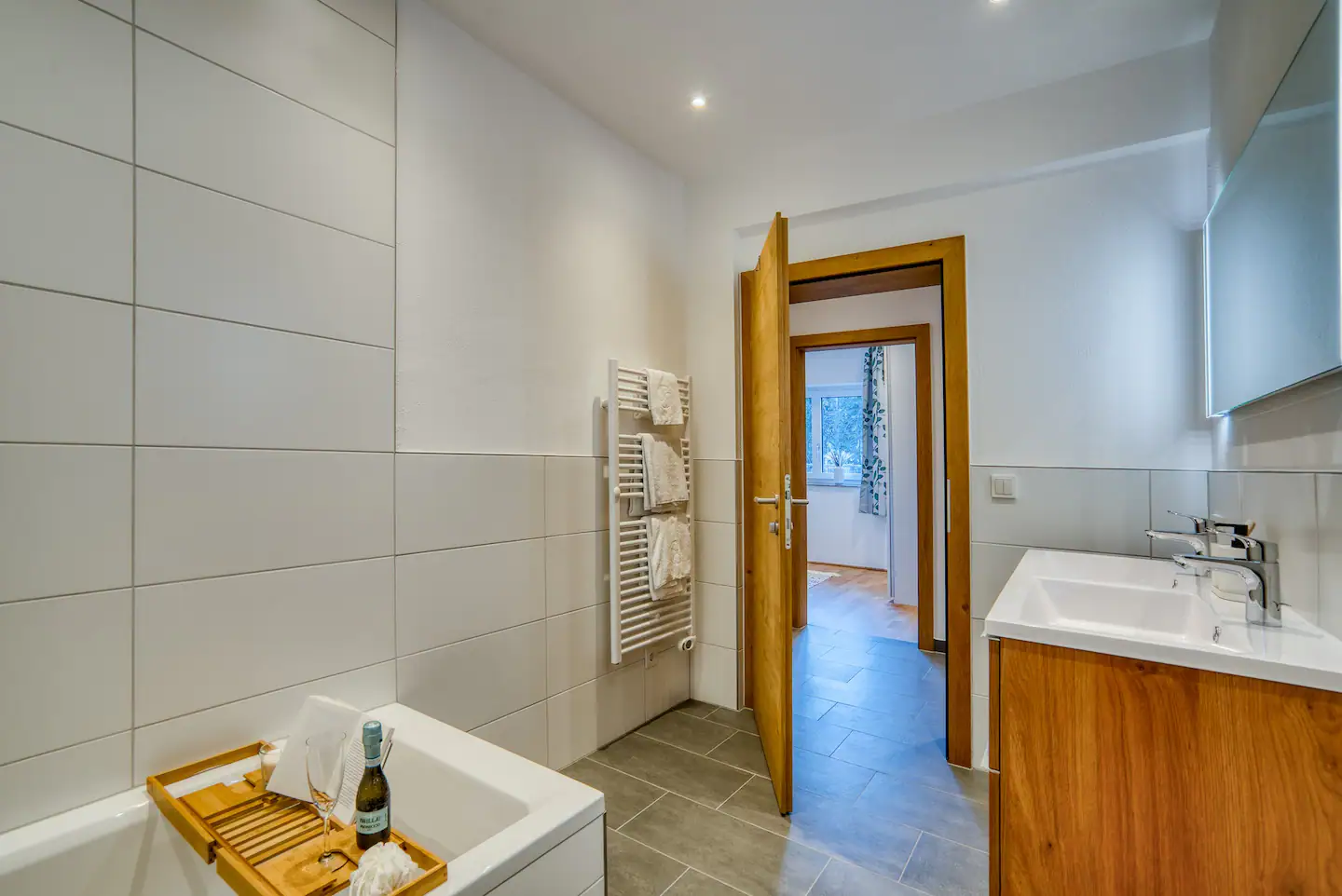 Das neu renovierte Badezimmer verfügt über eine Badewanne mit Glasduschabtrennung, sodass Sie sich nach Lust und Laune erfrischen können. Frische Handtücher und Badutensilien (Seife, Toilettenpapier) stellen wir Ihnen selbstverständlich zur Verfügung.