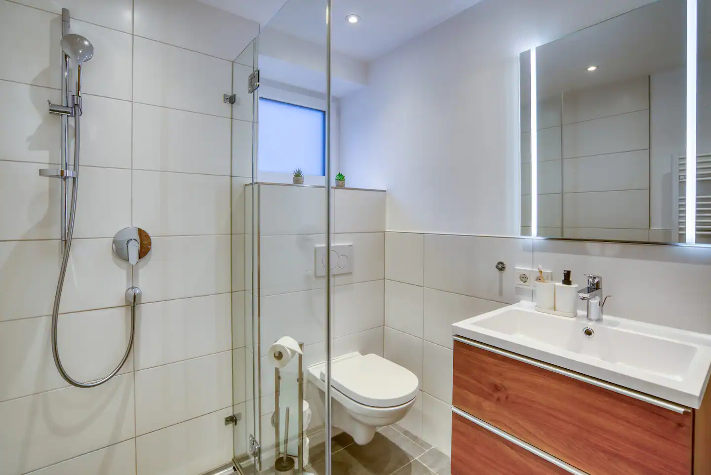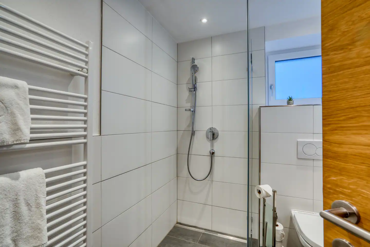 Das kleine Badezimmer verfügt über eine barrierefreie Dusche mit Glasduschabtrennung. Frische Handtücher und Badutensilien (Seife, Toilettenpapier) stellen wir Ihnen selbstverständlich zur Verfügung.