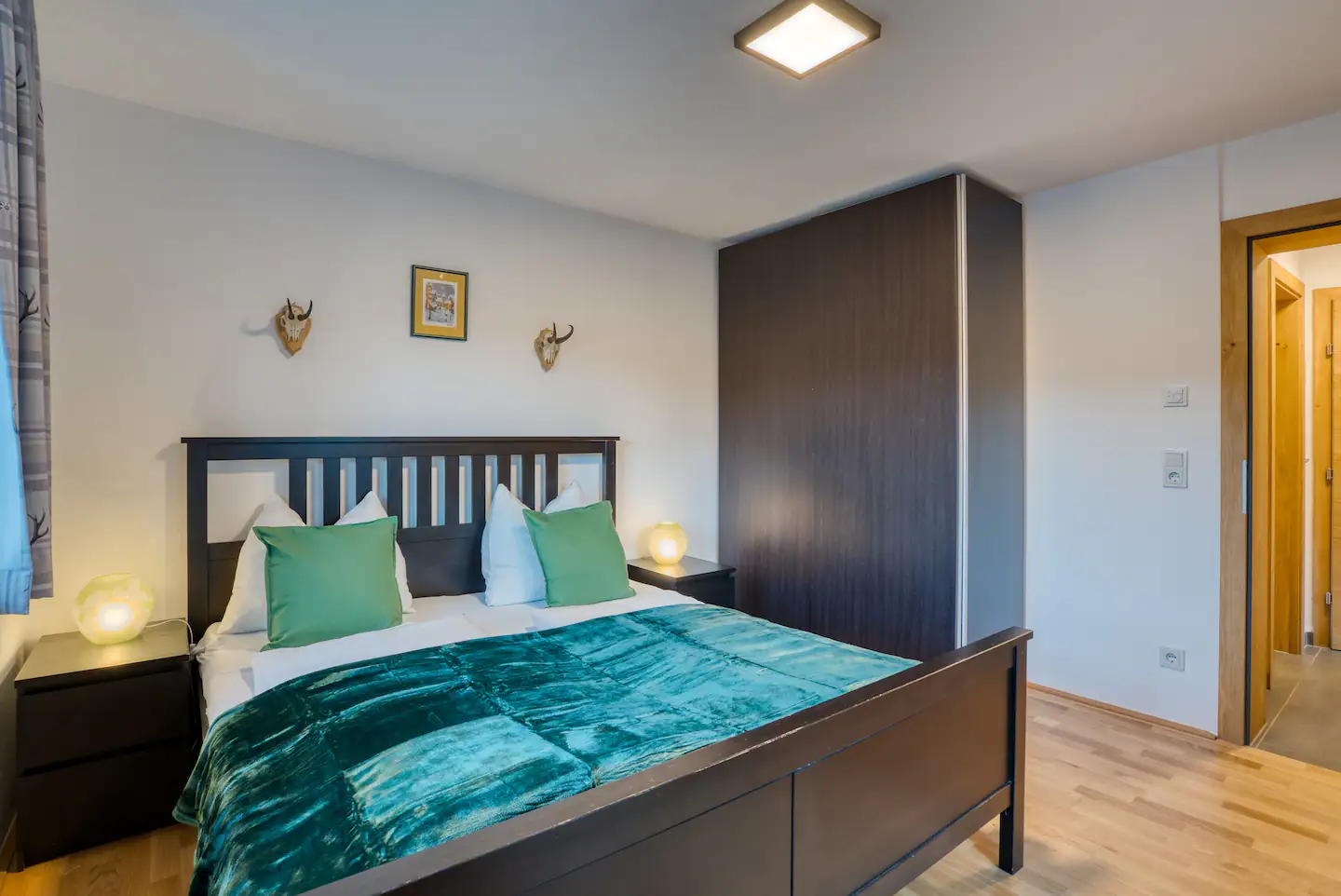 Vom Schlafzimmer aus haben Sie durch die beiden großen Fenster einen perfekten Ausblick auf die umliegende Berglandschaft. Vom Schlafzimmer und der Küche aus haben Sie Zugang zum großen Balkon, auf dem einige Sitzgelegenheiten für Sie bereitstehen.