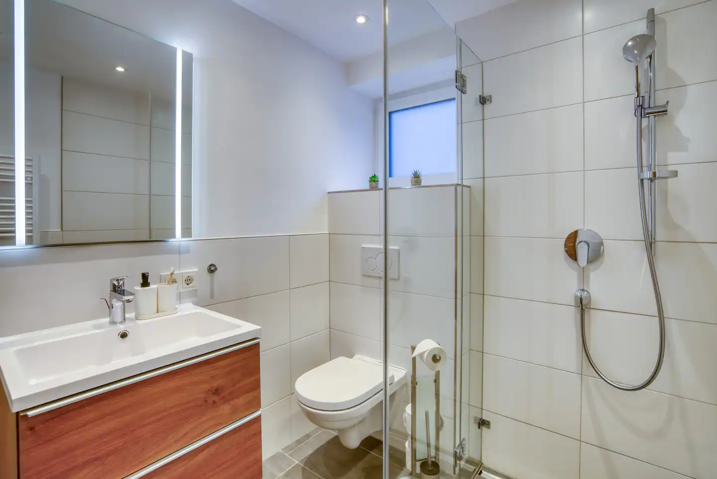 The small bathroom has a barrier-free shower with a glass shower enclosure. Of course, we provide fresh towels and bathroom essentials (soap, toilet paper).